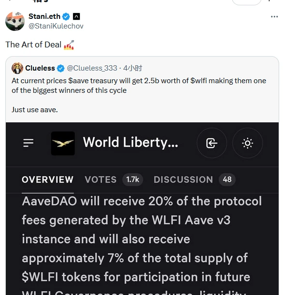 Aave创始人Stani.eth在回应社区质疑时,不仅确认了WLFI协议的有效性,还以“交易的艺术”这一幽默表述来回应相关传闻。这一说法暗含市场操纵的可能性,同时通过轻松的表达方式,巧妙转移了社区对协议本身争议的过度关注。这种回应方式展现了DeFi项目方在面临舆论压力时的典型危机公关策略,即用非正式但具传播力的话语维持项目形象,同时避免陷入技术细节的争论。