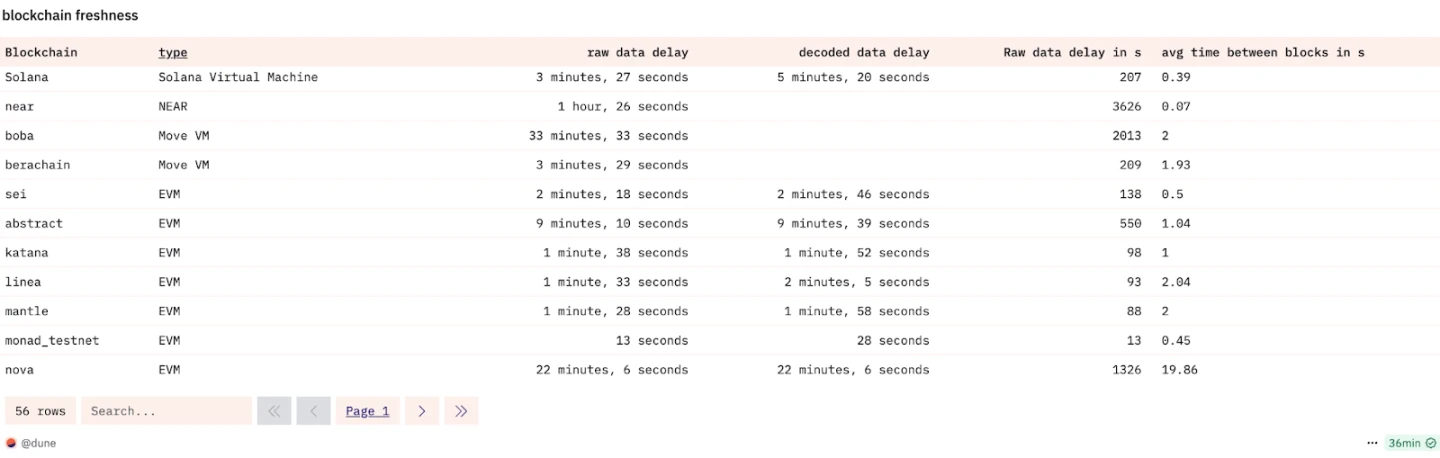 然而,下游数据基础设施大多仍依赖批处理ETL管道,不可避免地存在数据延迟。以Dune为例,Solana上的合约交互事件数据通常延迟约5分钟,协议层聚合数据甚至需等待1小时。