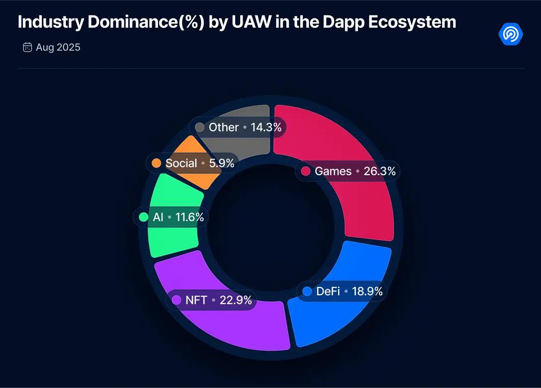 相比之下,游戏领域展现出较强韧性。虽然活跃度小幅下降4%,但游戏类DApp仍占据行业主导地位,重新成为活跃度最高的领域。这表明游戏作为链上参与的支柱,具有较强的抗波动能力。