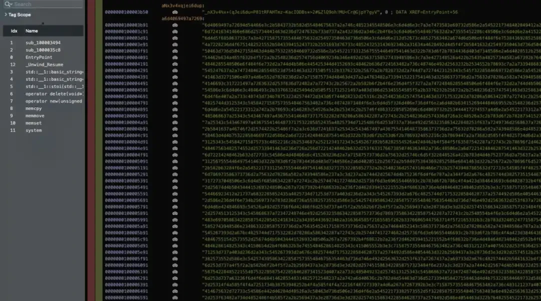 通过静态分析发现,恶意二进制文件的大部分数据都经过加密和编码处理,其入口代码主要用于数据解密和脚本执行。