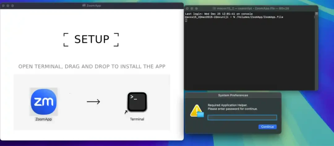 恶意文件如「ZoomApp_v.3.14.dmg」通常具备以下特征:要求用户在终端中执行脚本、诱导输入本机密码、隐藏可执行文件(如「.ZoomApp」),以及伪装成常见软件更新。用户应拒绝运行来源不明的安装包,并警惕任何索要密码的行为。