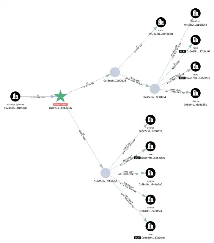 USDT 部分则主要流向 Binance、MEXC 和 FixedFloat 等平台,完成最终的资金分散。