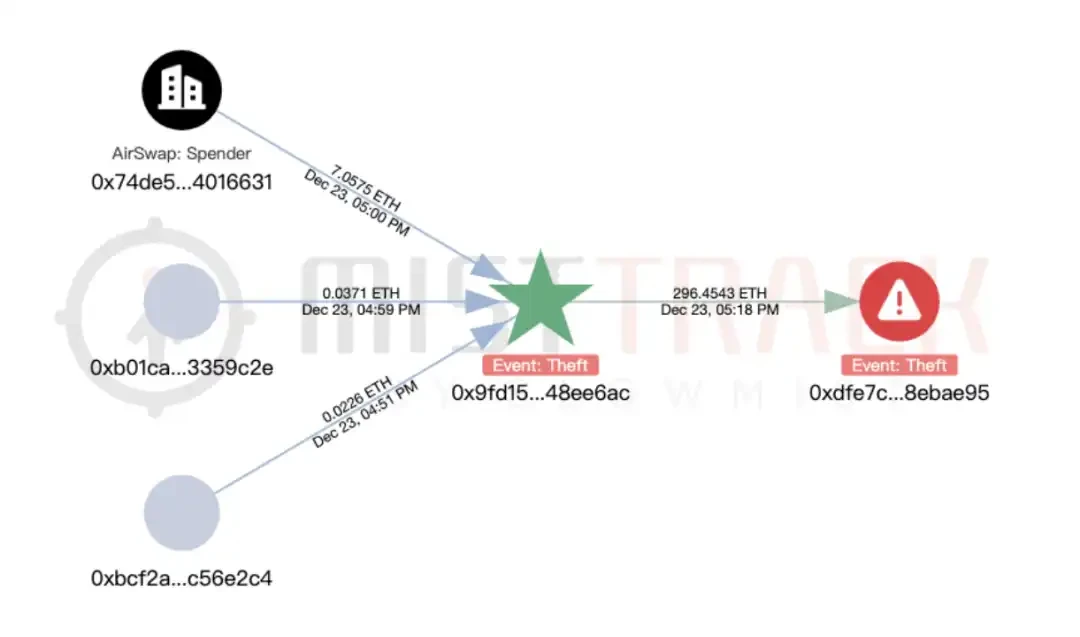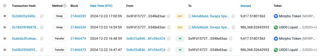 通过链上追踪工具 MistTrack 对黑客地址 0x9fd1… 的分析显示,该地址非法获利超过 100 万美元,资产类型包括 USD0++、MORPHO 和 ETH。其中,USD0++ 和 MORPHO 被统一兑换为 296 ETH,进入洗钱流程。