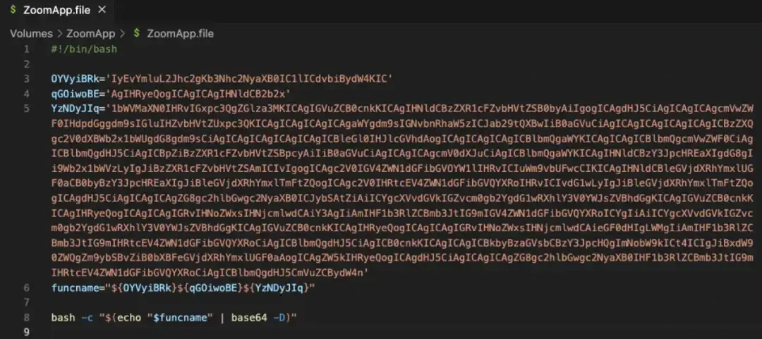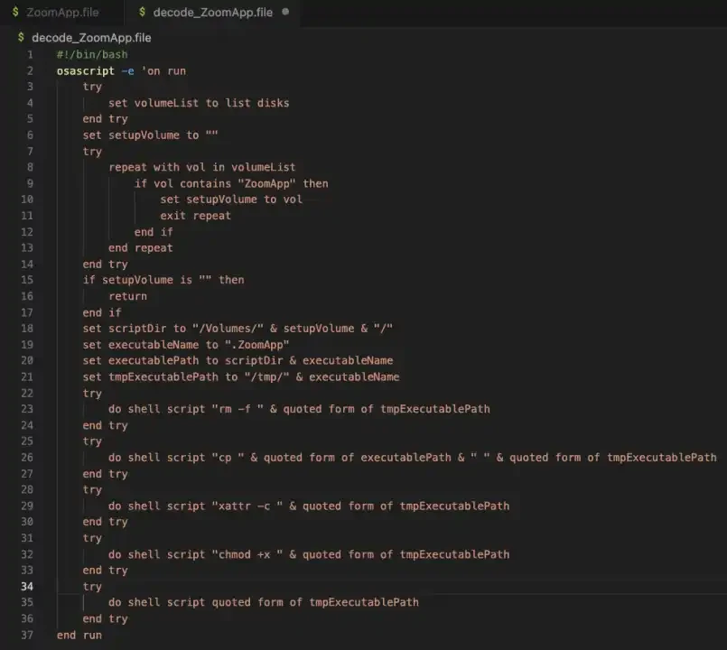 恶意脚本的核心是一个经过编码的osascript文件。解码后发现,该脚本会查找并运行一个名为「.ZoomApp」的隐藏可执行文件。
