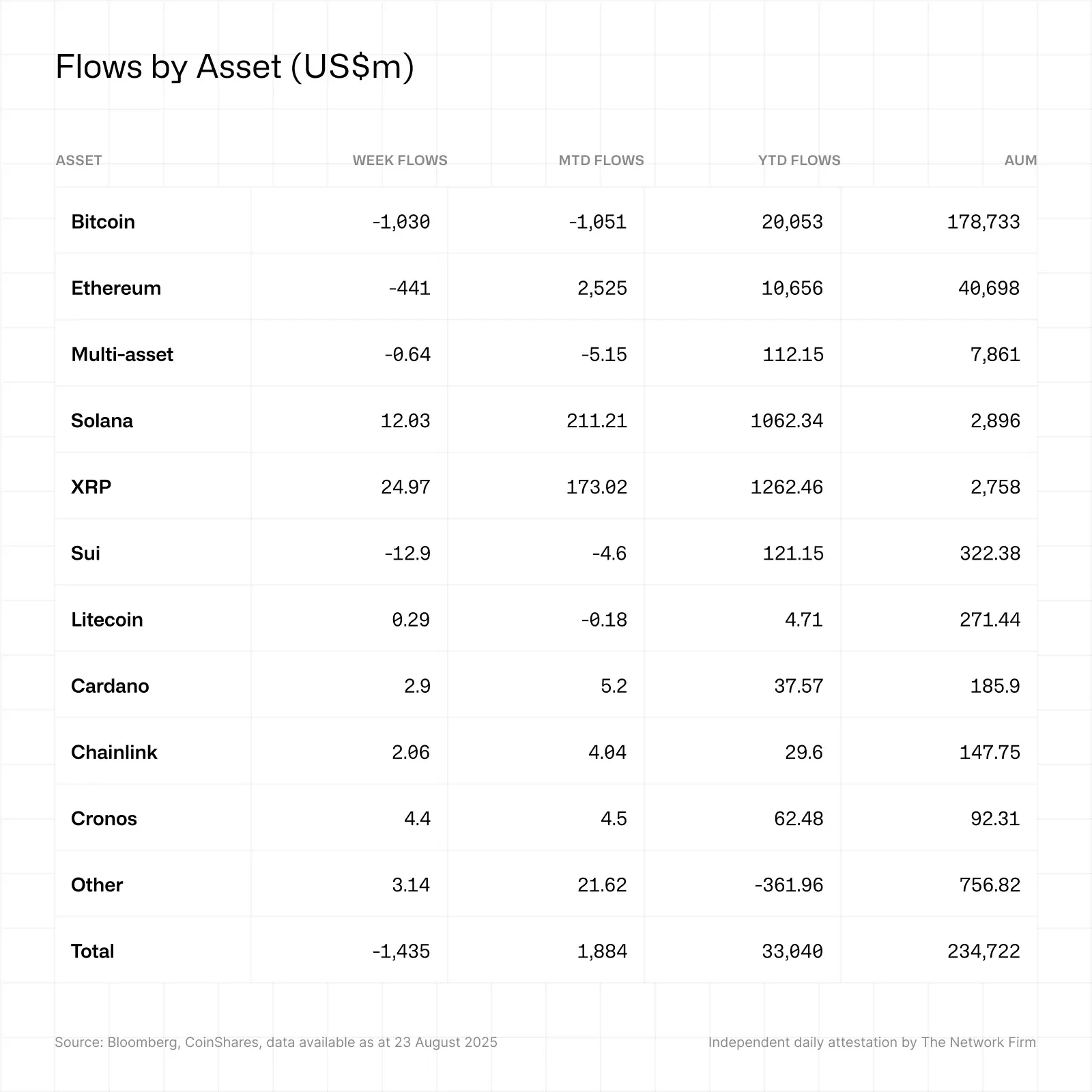 当前位置:首页 > 快讯 > 正文 上周数字资产投资产品流出14.3亿美元创3月新高 快讯 2025-08-25 21:45:56 浏览:37 Coinshares报告显示,上周数字资产投资产品资金流出达14.3亿美元,创3月以来最高纪录,同期ETP交易量攀升至380亿美元。比特币单周净流出10亿美元,以太坊资金外流仅为4.4亿美元。XRP、Solana和Cronos分别获得2500万美元、1200万美元和440万美元资金流入,Sui与Ton则出现1290万美元及150万美元资金撤出。 相关文章: CoinShares:上周数字资产投资产品流入27亿美元,连续11周资金净流入2025-06-30 16:21:39 CoinShares:数字资产投资产品连续12周流入180亿美元2025-07-07 17:32:06 CoinShares:上周数字资产投资产品资金流入43.9亿美元创新高2025-07-21 16:37:41 数字资产投资产品周流入19亿美元,以太坊吸金15.9亿创新高2025-07-28 16:52:42 数字资产投资产品周报:比特币资金赎回超4亿美元,以太坊连续15周净流入2025-08-04 17:11:45 数字资产投资产品单周吸金37.5亿美元,以太坊占比达77%2025-08-18 17:56:13 上周数字资产投资产品流出14.3亿美元创3月新高2025-08-25 21:45:56 数字资产投资产品8月吸金43.7亿美元,以太坊成最大赢家2025-09-01 17:24:18 数字资产投资产品周报:比特币净流入5.24亿美元,以太坊流出9.12亿美元2025-09-08 21:41:42 CoinShares周报:数字资产投资产品单周吸金33亿美元,比特币领涨2025-09-15 19:58:51