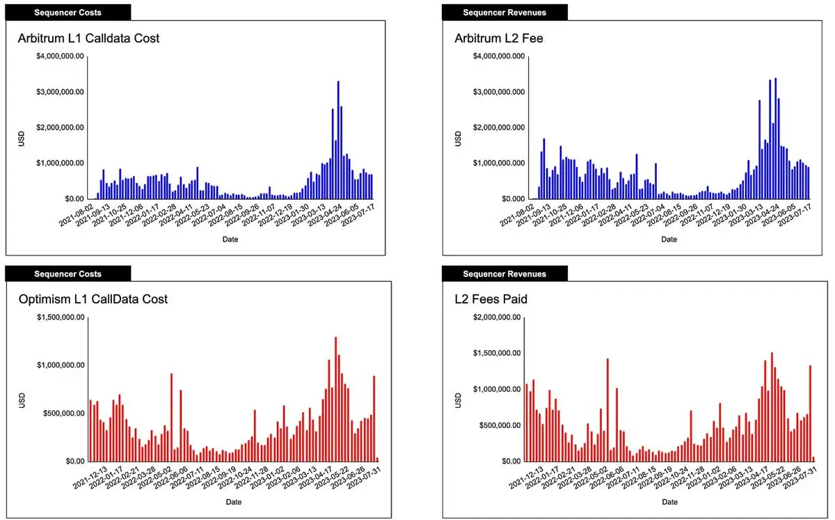 在L1费用定价机制上,Arbitrum和Optimism采用了不同的策略。Arbitrum使用动态预言机来估算L1 Gas价格,这意味着在没有治理干预的情况下,其定价方式在EIP-4844实施前后保持一致。