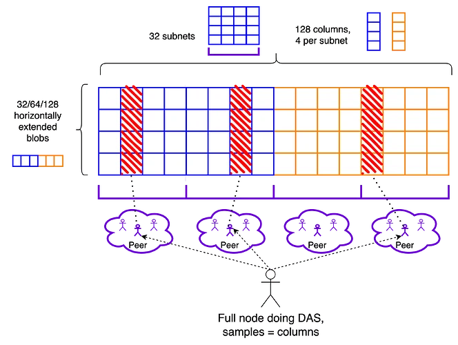 PeerDAS是数据可用性抽样(DAS)技术的一种简化实现方案。在该机制中,每个节点仅需存储全部Blob数据的一部分(例如1/8),并通过点对点网络维持多个连接。当节点需要对某段数据进行抽样验证时,它会向负责存储该数据片段的节点发起查询。这种分布式存储方式大幅降低了单个节点的存储压力。