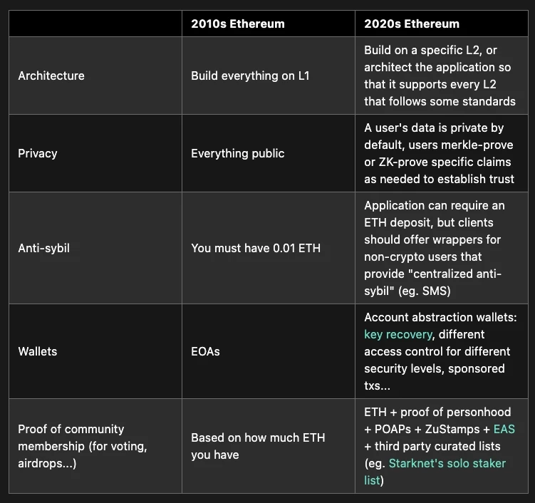 以太坊生态系统中的许多应用仍沿用着“2010年代工作流”模式,其核心操作集中在第一层(L1)。例如,大多数ENS活动仍在L1上进行,代币发行也普遍缺乏对第二层(L2)桥接代币可用性的系统规划。隐私保护方面同样滞后,POAP完全公开在链上,DAO和Gitcoin Grants仍采用透明的链上投票机制,容易受到贿赂和空投操控的影响。尽管ZK-SNARKs技术已成熟多年,许多应用仍未充分利用其潜力。