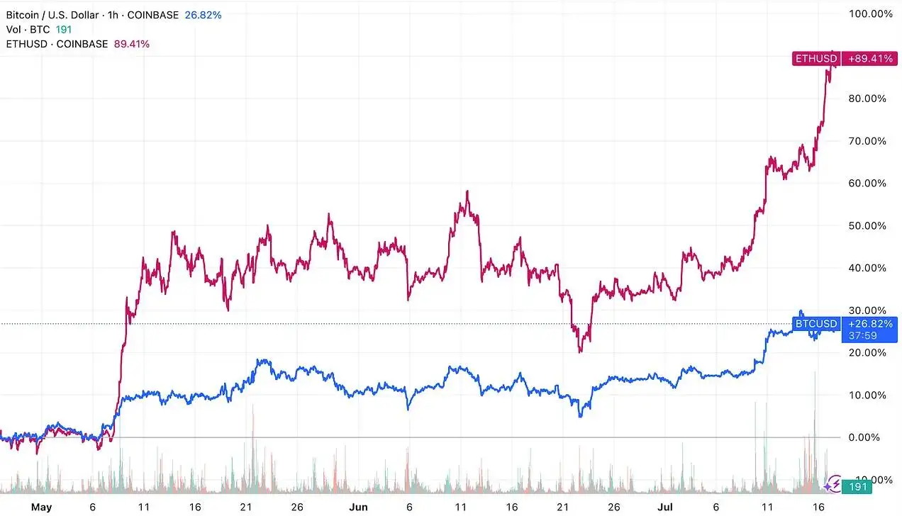 这一趋势已经开始影响市场表现。在资产管理策略的推动下,ETH的价格表现开始超越比特币,这在本轮市场周期中实属罕见: