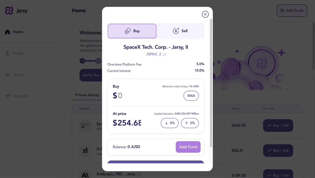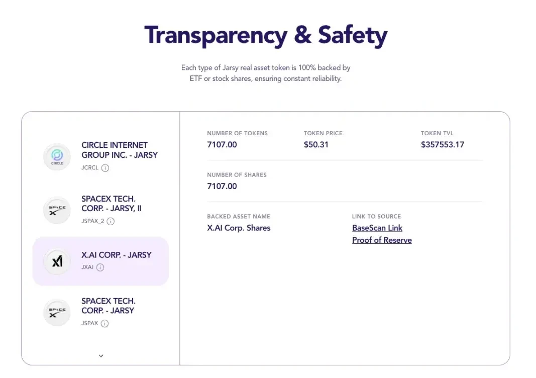 Jarsy采用了一种直接透明的代币化模式:平台每持有一股Pre-IPO股票,就发行一枚对应的代币。比如持有1000股SpaceX股票,就会铸造1000枚JSPAX代币。虽然投资者不直接持有股票,但能享有所有经济权益,包括股息和股价增值收益。