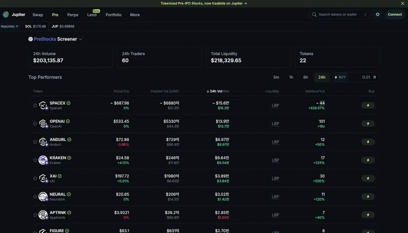PreStocks选择在Solana区块链上构建其平台,通过与Jupiter和Meteora等去中心化交易所(DEX)的深度集成,实现了全天候交易和即时结算功能。这种整合不仅提升了交易效率,还为代币借贷等更广泛的二级市场应用创造了可能性。Solana生态系统中已有的代币化公开股票(xStock)活跃交易,也为PreStocks带来了潜在的协同效应。