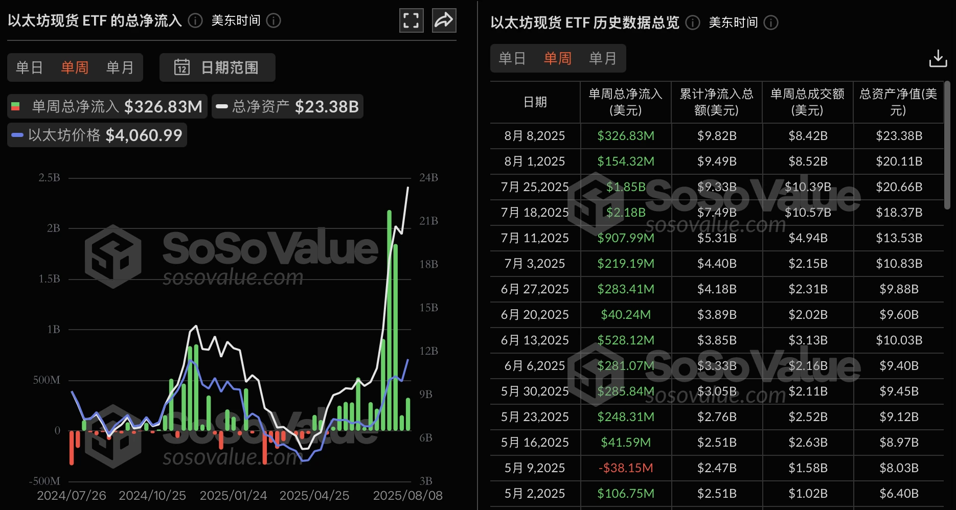 以太坊现货ETF市场正迎来前所未有的资金热潮,最新数据显示上周(8月4日至8月8日)单周净流入高达3.27亿美元,九只ETF产品全部实现资金净流入。这一现象反映出机构投资者对以太坊资产的持续看好。