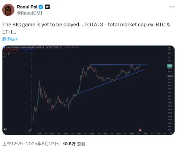 多位市场分析师对山寨币的未来走势给出了关键判断。高盛前高管、宏观研究机构 Real Vision 创始人 Raoul Pal 通过技术分析指出,Total3(除比特币和以太坊之外的山寨币总市值指标)正显示出重要的技术拐点,可能意味着整体行情即将启动。