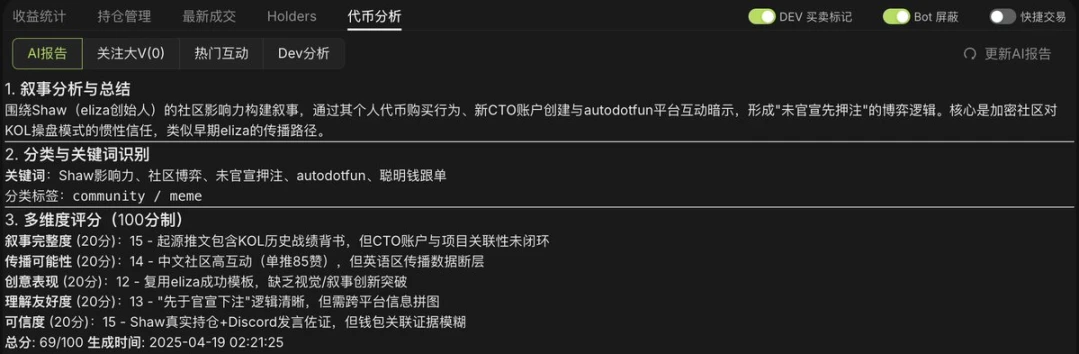 而6551 DEX更进一步,通过聚合推特内容、官网信息、评论、发盘记录和KOL动态,生成实时更新的AI报告,帮助交易者精准把握市场情绪和叙事走向。