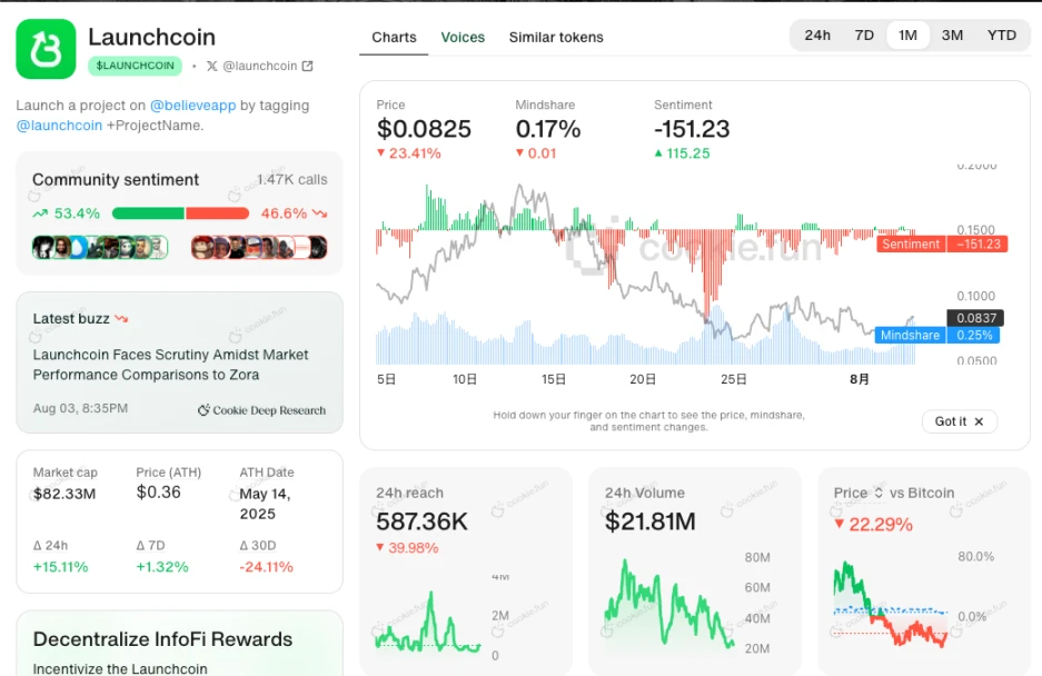 其次是情绪量化。以Cookie.fun为代表的平台对加密社区的推特内容进行聚合和情感分析,输出Mindshare(心智份额)、Sentiment(情绪指数)和Influence(影响力)等量化指标,并将这些情绪数据直接叠加到价格图表上,形成可视化的"情绪技术指标"。
