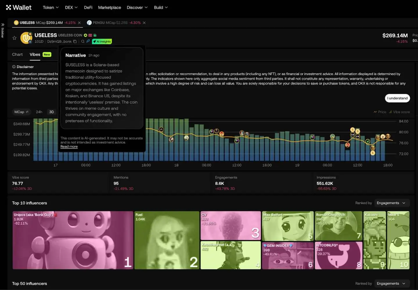 最后是创新的数据呈现模式。OKX DEX首创了将链下Vibes分析与行情数据并列展示的方式,聚合KOL喊单时间点、头部关联KOL、叙事摘要(Narrative Summary)及综合评分,大幅缩短用户的链下信息检索时间,成为广受用户欢迎的AI功能。