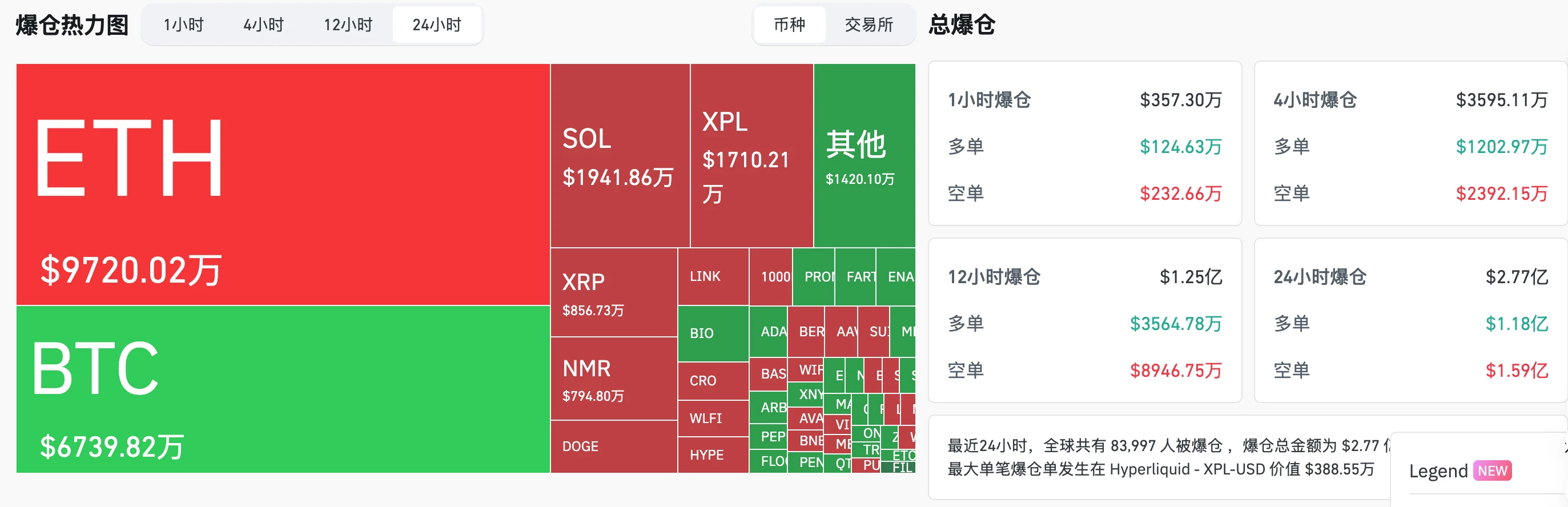 过去24小时内,全球共有83,997人被爆仓,爆仓总金额高达2.77亿美元。其中比特币爆仓6,739.82万美元,以太坊爆仓9,720万美元,SOL爆仓1,941.86万美元。这些数据揭示了市场的高波动性和多空双方的激烈交锋,尤其以太坊成为爆仓主要标的,显示其价格波动更为剧烈。