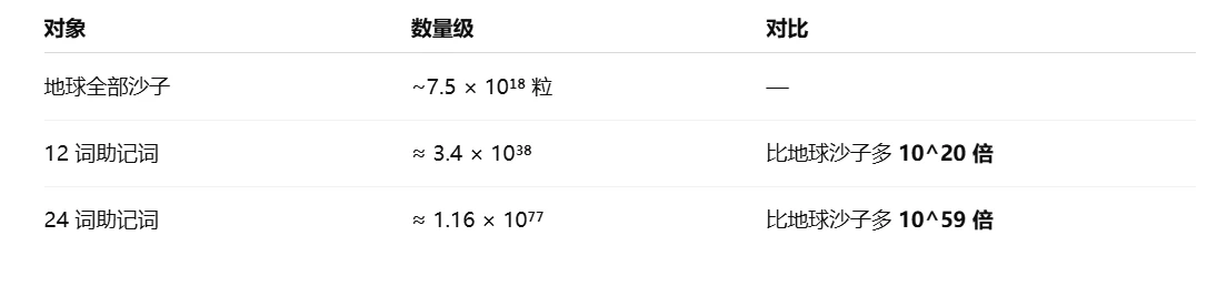 - 12个单词的组合数相当于地球沙子总数的4.5×10¹⁹倍