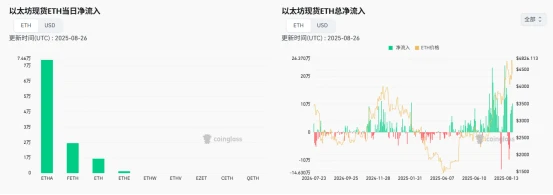 这些现象表明,加密资产正在成为政策博弈的衍生品。市场走势与特朗普的政治动作呈现高度关联性,传统金融市场与加密市场的联动性也在不断增强。从资金流向来看,约有20亿美元资金从比特币重新配置到以太坊,机构投资者对ETH的预期更为积极,美东时间8月26日以太坊现货ETF单日净流入达4.55亿美元,是比特币的5倍多。