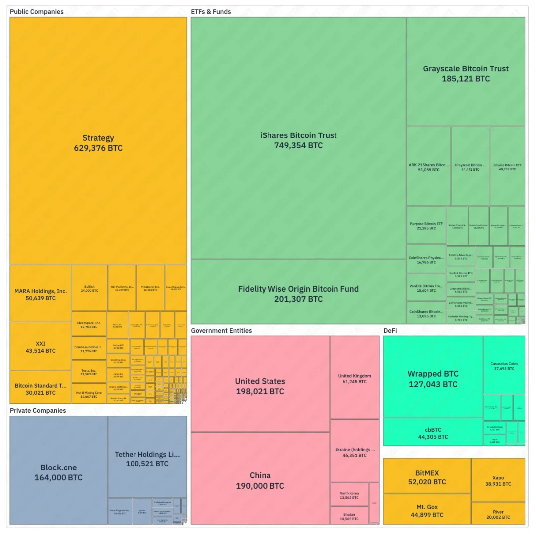 若法案全面实施,美国将持有100万枚BTC,约占比特币总量上限的4.8%。这一规模将超越最大持仓上市公司MicroStrategy(62.9万枚)和所有比特币ETF的总持仓量(约163万枚),成为全球最大的单一比特币持有主体。