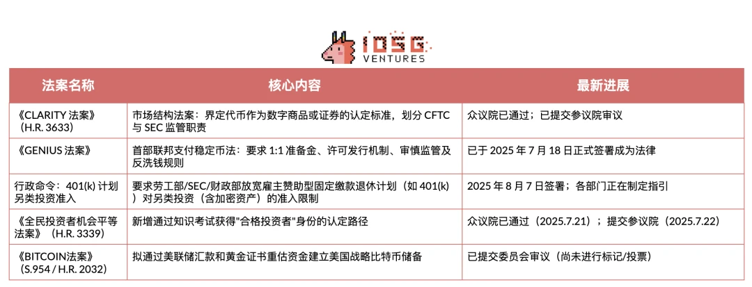 ,投资者应重点关注以下政策突破点:《GENIUS 法案》已正式生效,为支付型稳定币建立了基础监管框架;众议院通过的《CLARITY 法案》将明确划分数字资产由美国商品期货交易委员会(CFTC)或证券交易委员会(SEC)管辖的具体标准;行政命令正推动监管机构开放401(k)退休计划对加密资产的投资渠道;而众议院通过的合格投资者考试改革方案,有望显著扩大私募加密交易的参与人群。这些政策动向共同构成了美国加密监管新格局的核心要素,将为行业带来前所未有的发展机遇。