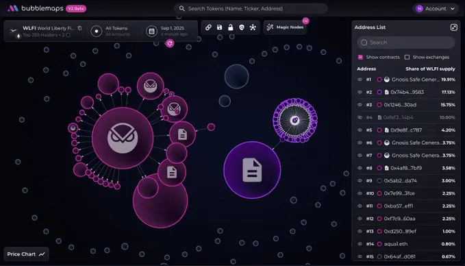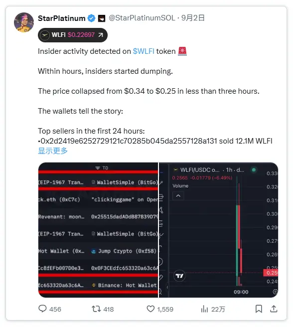 更值得警惕的是,WLFI在发行之初仅有25%的供应量进入流通。这种低流通量设计,配合少数地址的高度集中持仓,导致市场极易出现剧烈波动,表现出极端的脆弱性。在代币上线的最初几个小时内,就发生了大规模合约清算事件,期间内幕人士大量抛售,在短短数小时内就套现了数亿美元资金。