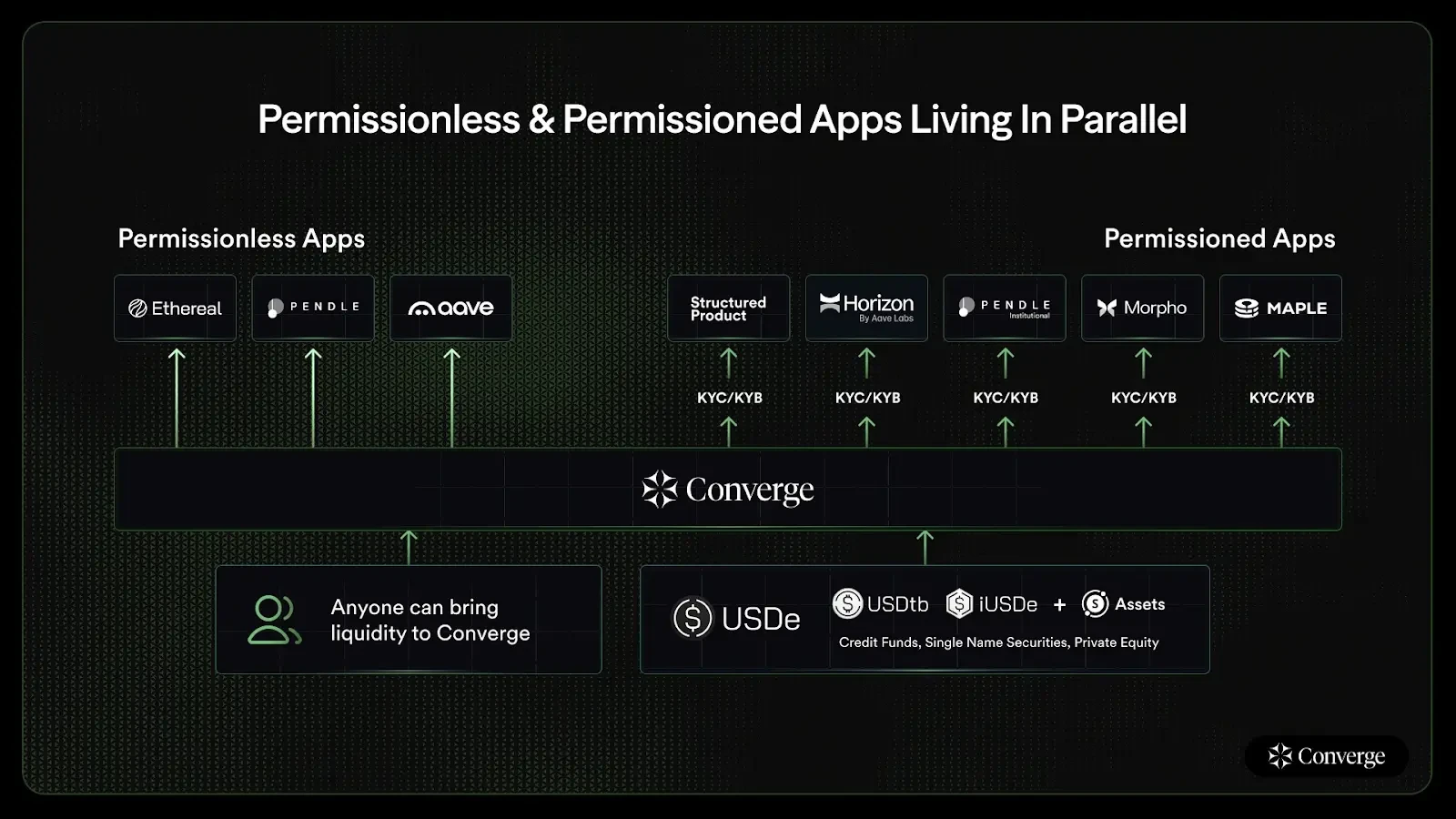 Ethena支持的Converge采取了不同的策略,通过“可选许可”机制平衡开放性与合规性。网络默认完全开放,支持自由参与DeFi活动,但在需要时可启用合规层以满足监管要求。这种设计旨在同时吸引加密原生用户和传统金融机构。