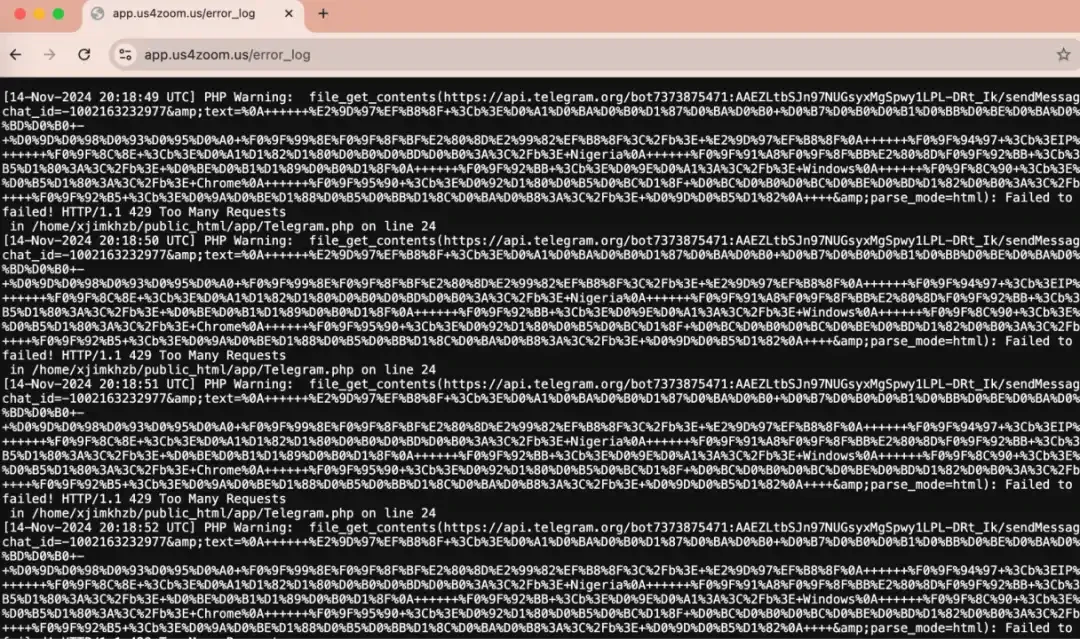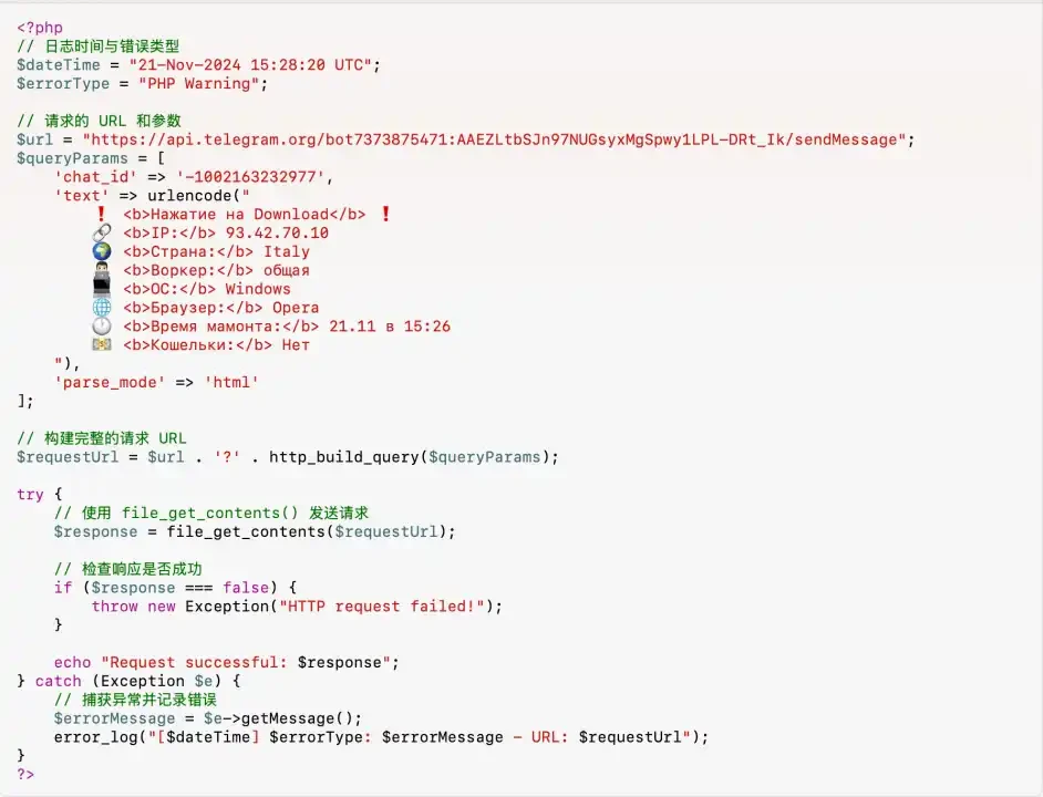 通过对该钓鱼域名的深入探测,安全团队发现了黑客的监控日志地址。日志内容显示,黑客通过Telegram API发送消息,且日志条目使用俄语编写。这一发现表明,攻击者很可能具备俄语背景。