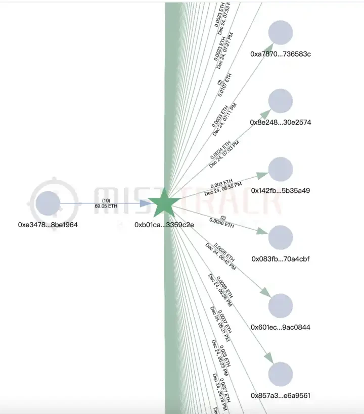 调查发现,黑客地址曾收到来自 0xb01c… 的小额 ETH 转账,疑似用于支付后续交易的手续费。该地址行为异常,仅有一个资金来源,却向近 8800 个地址转出 ETH,初步判断是一个专门提供手续费的平台地址。