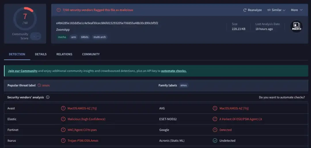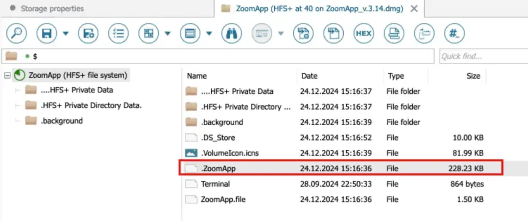 黑客通过名为「ZoomApp_v.3.14.dmg」的恶意安装包实施攻击。该文件伪装成Zoom客户端,诱导用户在终端中执行名为ZoomApp.file的恶意脚本。