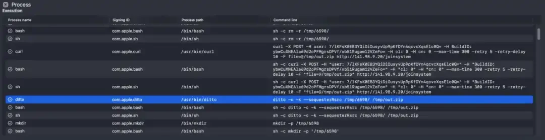 在动态执行监控中,恶意程序会启动多个进程来采集本机数据,并建立网络连接将窃取的信息发送至后台服务器。
