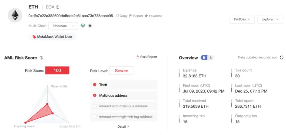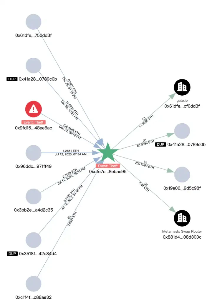 被盗的 296.45 ETH 被转移至新地址 0xdfe7…,该地址自 2023 年 7 月起活跃,涉及多条区块链,仍持有 32.81 ETH。其主要转出路径包括:200.79 ETH 转至 0x19e0…,63.03 ETH 转至 0x41a2…,部分 ETH 被兑换为 15,720 USDT,另有 14.39 ETH 流入 Gate.io 交易所。