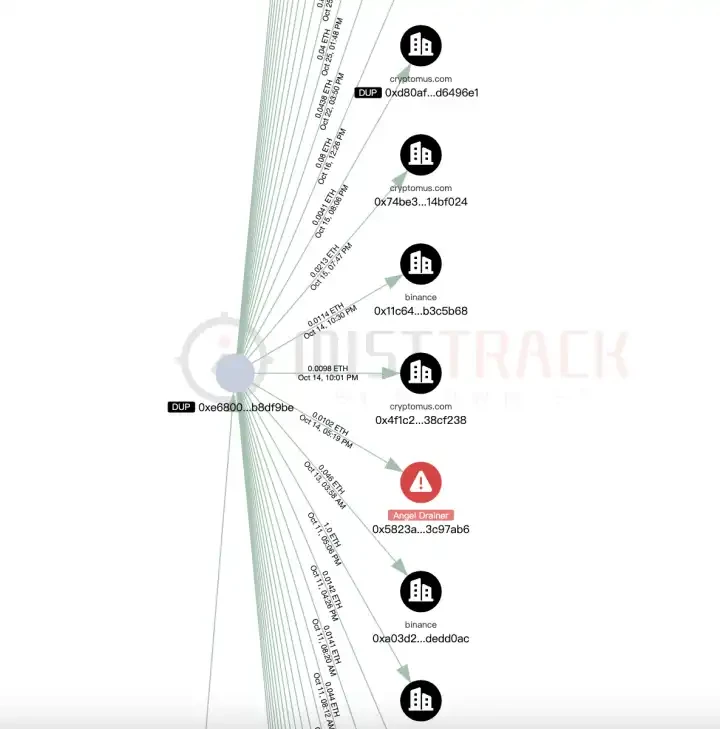 后续资金通过多个平台如 Bybit、Cryptomus、Swapspace 和 MEXC 等进行分散转移,部分地址与 Angel Drainer 等恶意标记高度相关。此外,尚有 99.96 ETH 暂存于地址 0x3624… 未进一步转移。