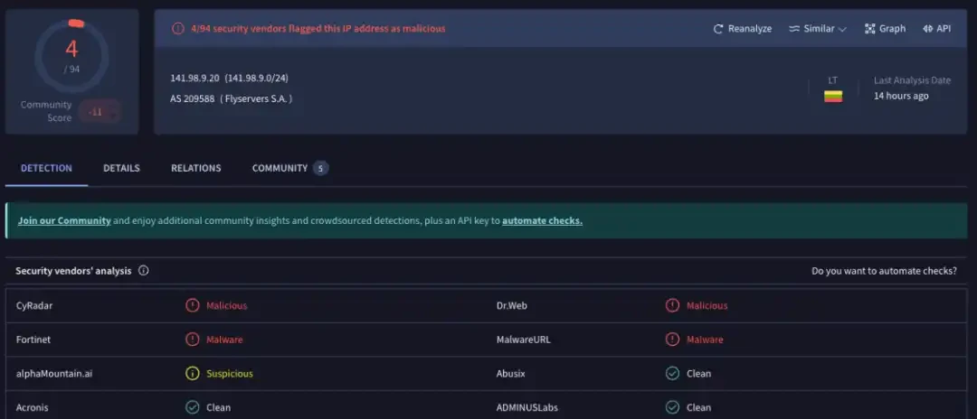 该服务器的 IP 地址为 141.98.9.20,经查位于荷兰,现已被多家威胁情报平台标记为恶意地址。