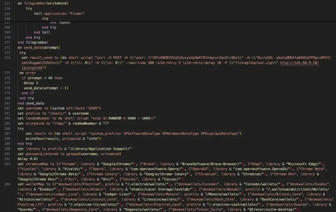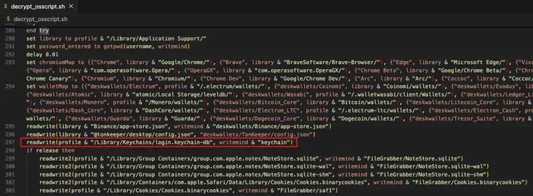 该osascript脚本被设计用于窃取用户KeyChain中存储的敏感数据。KeyChain是操作系统保存密码、密钥及其他凭据的安全仓库,一旦被读取,黑客就可能获取到加密钱包的助记词、私钥等关键信息。