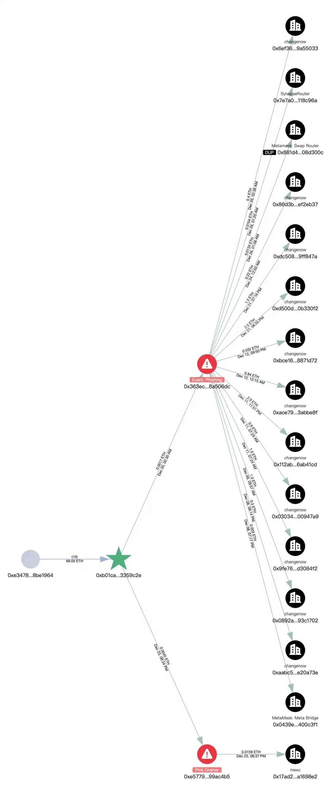 进一步分析该手续费平台的转出记录,筛选出被标记为恶意的地址,关联到两个钓鱼地址,其中一个与知名钓鱼组织 Pink Drainer 有关。这些地址的资金主要流向 ChangeNOW 和 MEXC 等混币平台,试图掩盖资金踪迹。