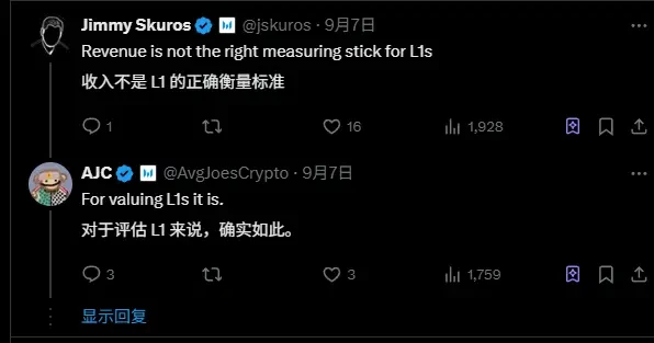 Messari 企业研究经理 AJC 指出,尽管 ETH 价格在8月创下新高,但以太坊当月收入仅为3920万美元,同比2023年8月的1.574亿美元下降了75%,同比2024年8月的6480万美元下降了40%。这是自2021年1月以来以太坊历史上第四低的月收入水平。AJC 强调,收入是评判L1健康度的核心指标,因为收入主要来自交易费用和区块空间使用费,直接反映用户对链的实际需求。他认为,收入趋向零意味着用户对主链的需求在萎缩,即使 L2 生态繁荣,整个网络也缺乏足够的新增用户来支撑 L2 的用量。