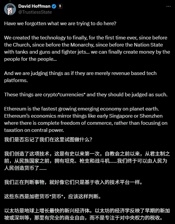 反对派强调,以太坊正在经历从执行层向全球结算层的战略转型,这种演变必然伴随收入模式的改变。真正的加密精神不在于短期收入最大化,而在于构建一个开放、可及且充满活力的数字经济体。
