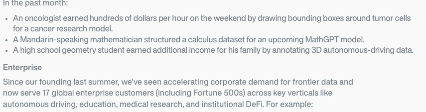 Sapien 的客户名单中包括阿里巴巴、丰田、百度、联想等传统行业巨头,以及 AI 图像生成领域的独角兽 Midjourney。这些合作不仅验证了 Sapien 数据服务机制的有效性,也表明去中心化 AI 数据服务正获得主流企业的认可。尤其值得关注的是与 Midjourney 的合作,作为对数据质量要求极高的头部 AI 图像项目,其选择 Sapien 作为数据供应商,充分证明了平台所提供数据的可靠性和高质量。