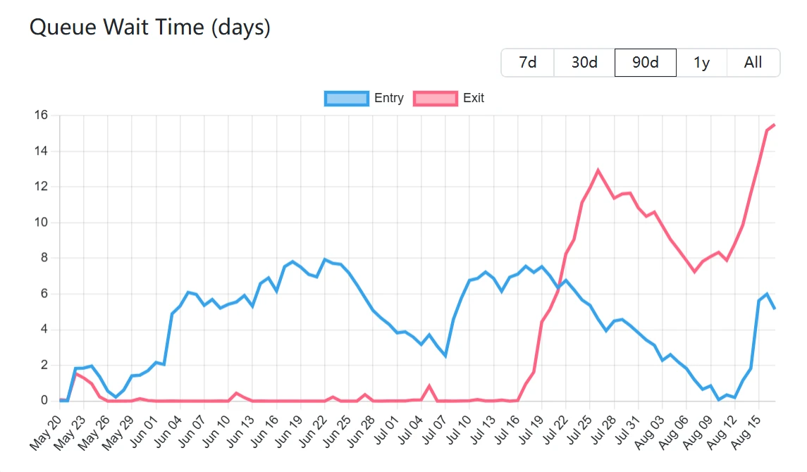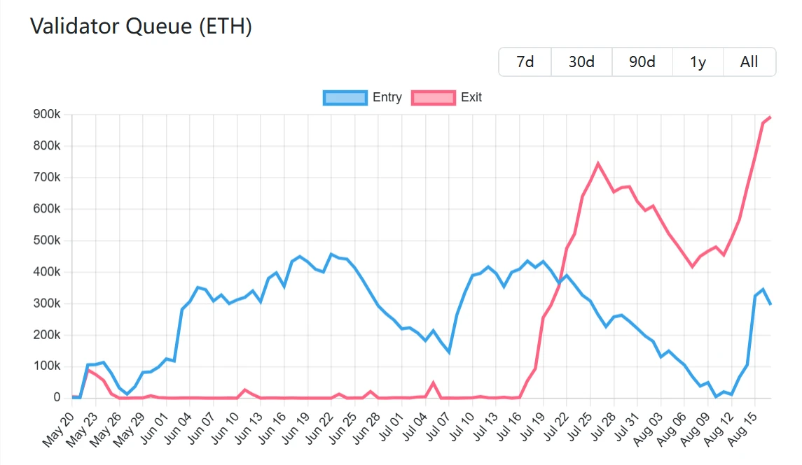 当前位置:首页 > 快讯 > 正文 以太坊PoS网络验证者退出与新增质押规模分析 快讯 2025-08-18 08:53:21 浏览:51 以太坊PoS网络数据显示,截至8月18日,验证者退出队列规模达872,893枚ETH(约39亿美元),该数量已连续6日增长,当前退出等待周期为15天4小时。同期待激活的新增质押ETH数量为259,783枚(约11.6亿美元),预计需等待4天12小时完成节点部署。 相关文章: 以太坊验证者退出队列规模达51.9万ETH 创年内新高2025-07-23 09:23:09 以太坊合并后质押生态关键指标分析2025-08-07 15:19:02 以太坊PoS网络退出队列激增,准入需求下降2025-08-17 14:37:08 以太坊PoS网络验证者退出与新增质押规模分析2025-08-18 08:53:21 以太坊质押退出高峰将至,ETH价格或承压下行2025-08-18 23:05:50 以太坊PoS网络退出队列达85.5万枚ETH,新验证者准入排队时间延长至3天2025-08-23 09:29:59 以太坊PoS网络质押量突破3560万ETH,退出队列超百万枚2025-08-27 14:22:26 以太坊PoS网络待质押ETH量创两年新高,待退出规模持续缩减2025-09-03 13:15:42 质押服务商Kiln启动以太坊验证器退出流程应对Solana事件2025-09-10 11:57:17 以太坊PoS网络验证者队伍数据更新:退出与准入模式及延迟情况2025-09-12 14:41:35