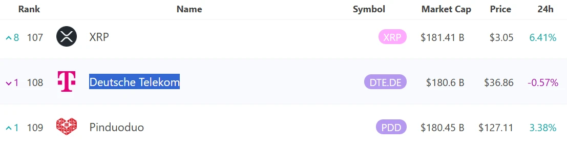 XRP价格于8月23日突破3美元关口,最高触及3.05美元,24小时涨幅达6.41%。8MarketCap数据显示其市值激增至1814.1亿美元,超越万事达(1840.5亿美元)及德国电信Deutsche Telekom,位列全球资产市值排名第107位。