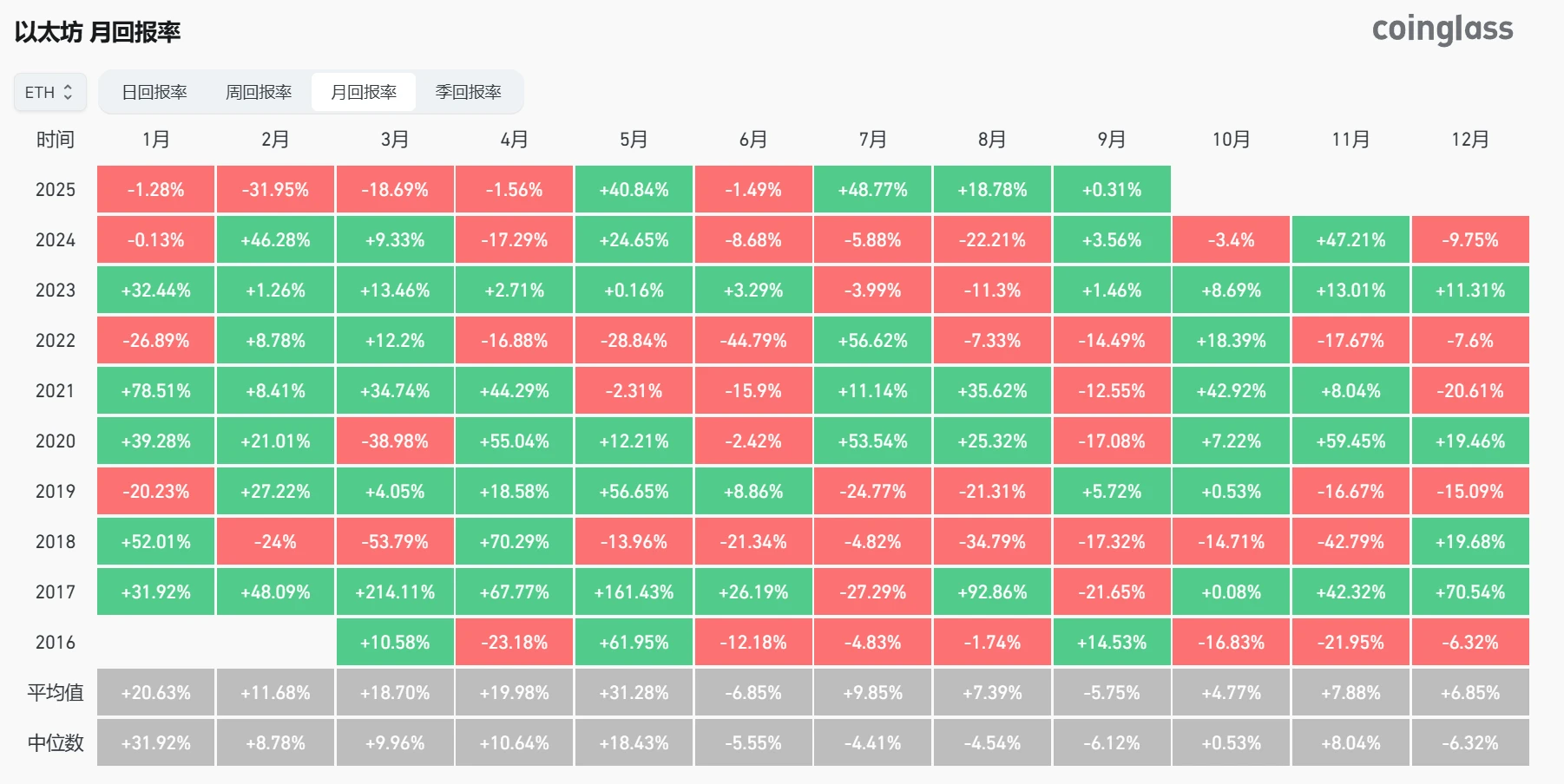 当前位置:首页 > 快讯 > 正文 比特币和以太坊9月历史回报率分析 快讯 2025-09-01 14:53:27 浏览:56 Coinglass数据显示,比特币和以太坊历史9月平均回报率分别为-3.55%和-5.75%。以太坊在过去的9年中,仅有4个年份的9月回报率为正值,分别为2016、2019、2023和2024年;比特币在过去12年中同样仅有4个9月实现正收益,对应年份为2015、2016、2023和2024年。 相关文章: 比特币逼近历史高点,以太坊突破4200美元关键位2025-08-14 11:44:54 比特币站稳11.93万 以太坊逼近历史高点2025-08-15 17:29:43 8月15日比特币与以太坊ETF资金流入情况分析2025-08-15 22:58:53 麻吉大哥8月25日杠杆做多比特币与以太坊2025-08-25 13:01:57 8月27日比特币与以太坊ETF净流入数据2025-08-27 22:03:46 8月美国以太坊现货行ETF净流入创历史新高 比特币ETF同期净流出2025-09-01 12:03:36 比特币和以太坊9月历史回报率分析2025-09-01 14:53:27 巨鲸45分钟提取5,100枚以太坊及历史提币记录分析2025-09-03 11:30:22 以太坊质押经济风险与回报分析:质押率攀升下的货币政策博弈2025-09-05 14:49:43 币安9月储备报告:以太坊持仓骤降,比特币储备增长2025-09-08 15:04:27