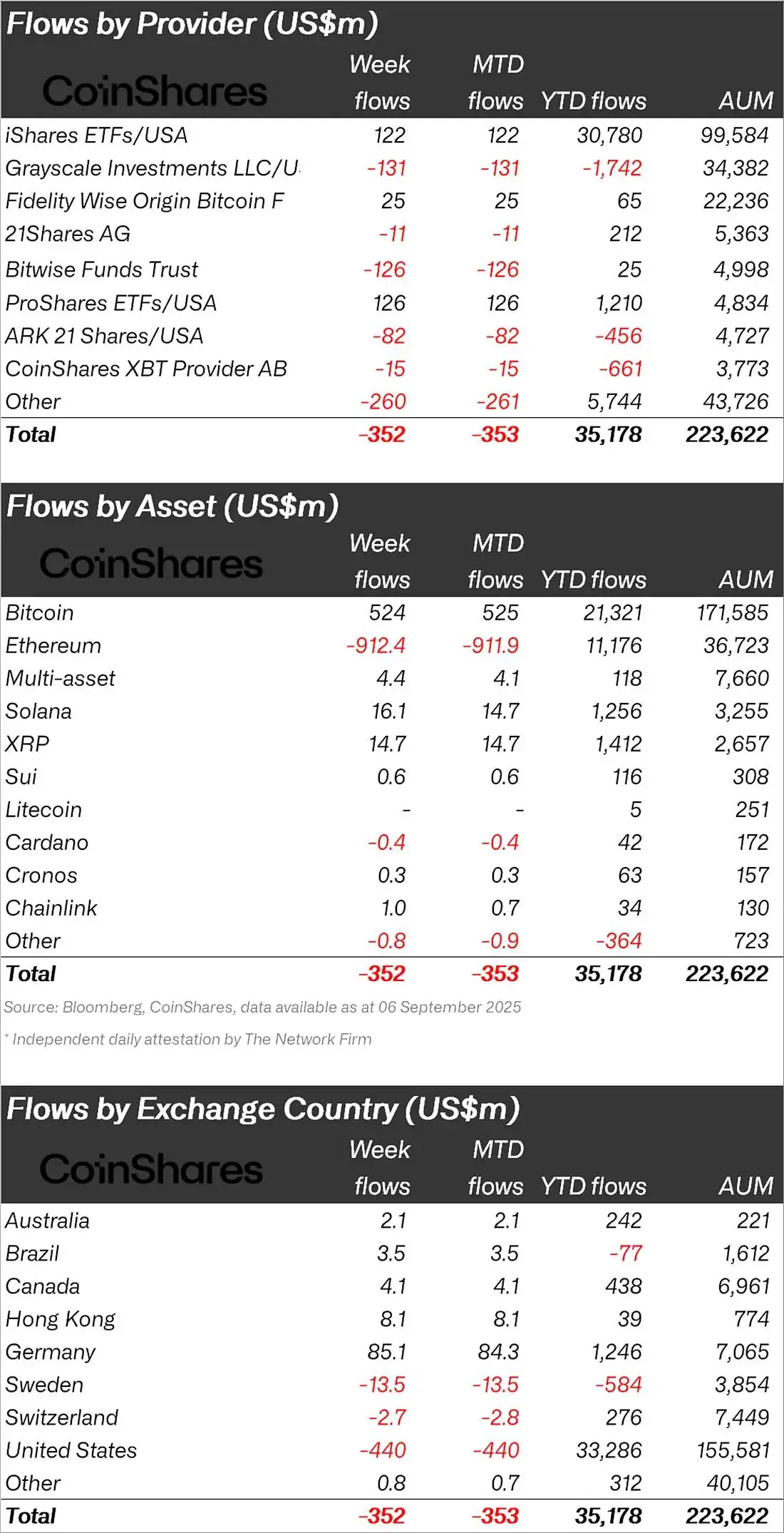 当前位置:首页 > 快讯 > 正文 数字资产投资产品周报:比特币净流入5.24亿美元,以太坊流出9.12亿美元 快讯 2025-09-08 21:41:42 浏览:45 CoinShares最新周报显示,截至9月8日当周数字资产投资产品遭遇3.52亿美元净流出,交易量环比下滑27%。分项数据显示,比特币单周获5.24亿美元净流入,以太坊则出现9.12亿美元净流出,Solana与XRP分别录得1470万美元资金注入。从地区分布来看,美国市场遭遇4.4亿美元资金外流,德国和香港地区分别吸引8,510万美元和810万美元净流入。 相关文章: CoinShares:数字资产投资产品连续12周流入180亿美元2025-07-07 17:32:06 CoinShares周报:数字资产投资产品连续13周资金流入2025-07-14 17:37:14 数字资产投资产品周流入19亿美元,以太坊吸金15.9亿创新高2025-07-28 16:52:42 数字资产投资产品周报:比特币资金赎回超4亿美元,以太坊连续15周净流入2025-08-04 17:11:45 数字资产投资产品单周吸金37.5亿美元,以太坊占比达77%2025-08-18 17:56:13 上周数字资产投资产品流出14.3亿美元创3月新高2025-08-25 21:45:56 数字资产投资产品8月吸金43.7亿美元,以太坊成最大赢家2025-09-01 17:24:18 HashKey计划设立5亿美元数字资产投资基金 布局比特币及以太坊2025-09-08 18:09:02 数字资产投资产品周报:比特币净流入5.24亿美元,以太坊流出9.12亿美元2025-09-08 21:41:42 CoinShares周报:数字资产投资产品单周吸金33亿美元,比特币领涨2025-09-15 19:58:51