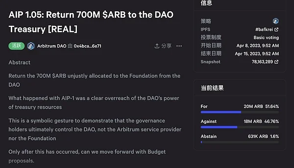 2023年3月,Arbitrum社区在AIP-1提案中暴露出严重的治理危机。该提案拟将7.5亿枚ARB(约合10亿美元)划拨给基金会服务商Lemma,但社区发现资金已提前转移至基金会地址。这一违背去中心化原则的操作引发82.56%的反对票,最终迫使团队拆分提案并启动资金返还投票程序。