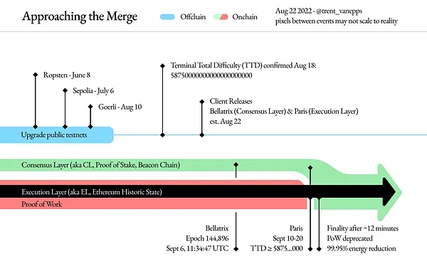 以太坊合并进程将分两个关键阶段推进。第一阶段Bellatrix升级已确定于UTC时间9月6日11:34:47在信标链第144896个epoch触发,这标志着PoS共识机制在信标链的正式激活。该升级为后续执行层过渡铺设基础设施,相当于为历史性合并按下启动键。