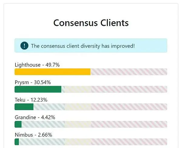 以太坊网络在客户端多样性上面临严峻挑战,这种挑战在共识层和执行层呈现不同特征。历史数据显示,共识层曾长期受Prysm客户端主导,其市场份额一度高达75%,这种单一客户端主导的局面为网络稳定性埋下重大隐患——若该客户端出现致命漏洞,可能导致大规模验证者集体掉线。