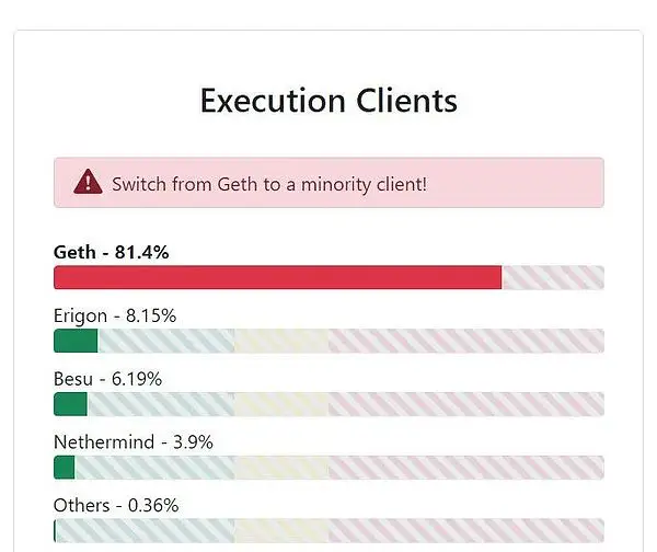 执行层的情况更为严峻,Geth客户端长期占据垄断地位。尽管Erigon、Nethermind等替代客户端持续优化,但多数节点仍依赖Geth作为执行环境。这种依赖性使网络暴露在”单点故障”风险之下,一旦Geth出现严重错误,将引发连锁反应。
