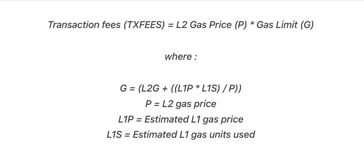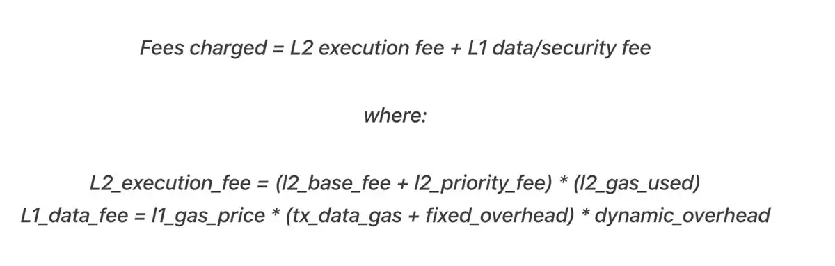L2执行费用类似于以太坊的Gas费,等于交易使用的Gas量乘以Gas价格。而L1安全费用则是为了覆盖将交易数据发布回以太坊主网的成本,因为排序器需要支付L1 Gas费来提交这些交易。