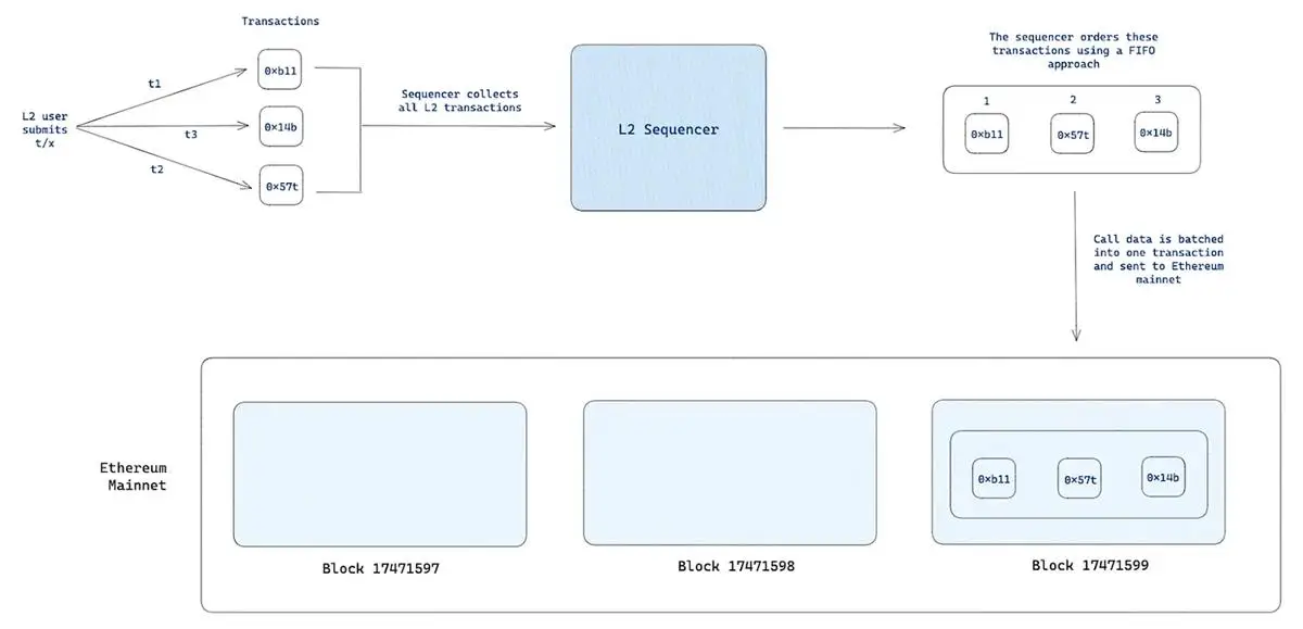 排序器是L2网络中将用户交易收集并打包提交至以太坊主网的核心组件。在的中心化模式下,其运作流程如下:首先,用户在L2链上执行各类操作(如DeFi交易、NFT转移或普通转账);随后,这些交易被中心化排序器统一收集;接着,排序器采用先进先出(FIFO)的规则对这些交易进行排序,并将其压缩为单个区块或批量交易;最后,排序器将这批处理好的数据提交到以太坊主网,等待区块确认。