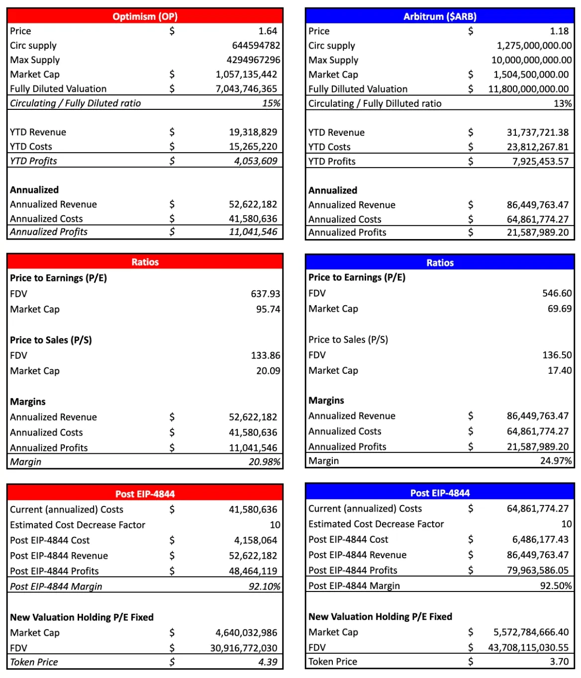 这种成本的大幅下降将对L2生态系统产生深远影响。在收入保持不变的情况下,利润和利润率将显著提升。具体到各个方案,Arbitrum由于其L1定价预言机机制,很可能将100%的费用节省传递给用户;而Optimism则可以通过动态开销变量来调整成本传递比例。如果成本降低10倍,同时交易量因费用下降而增长40%,预计将对ARB和OP的代币价值产生积极影响。